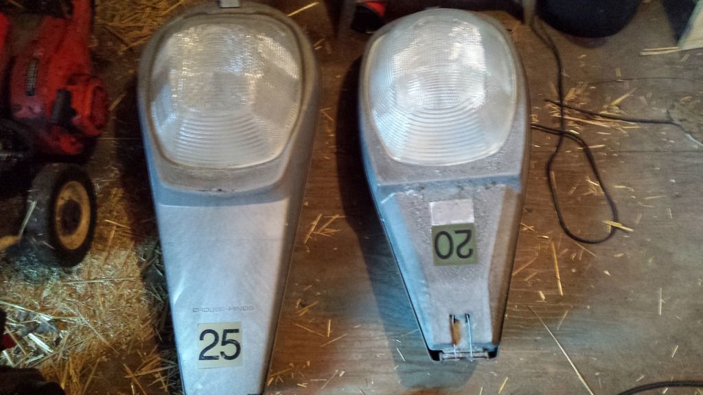 I only could really fit two in the back of this new Focus Hatch back lol. If I was out driving my 1978 Chevrolet Bel Air, I would have grabbed like 8 or more lol. They are both 250w HPS and I do believe that the one on the left is a Crouse Hinds OV15.
